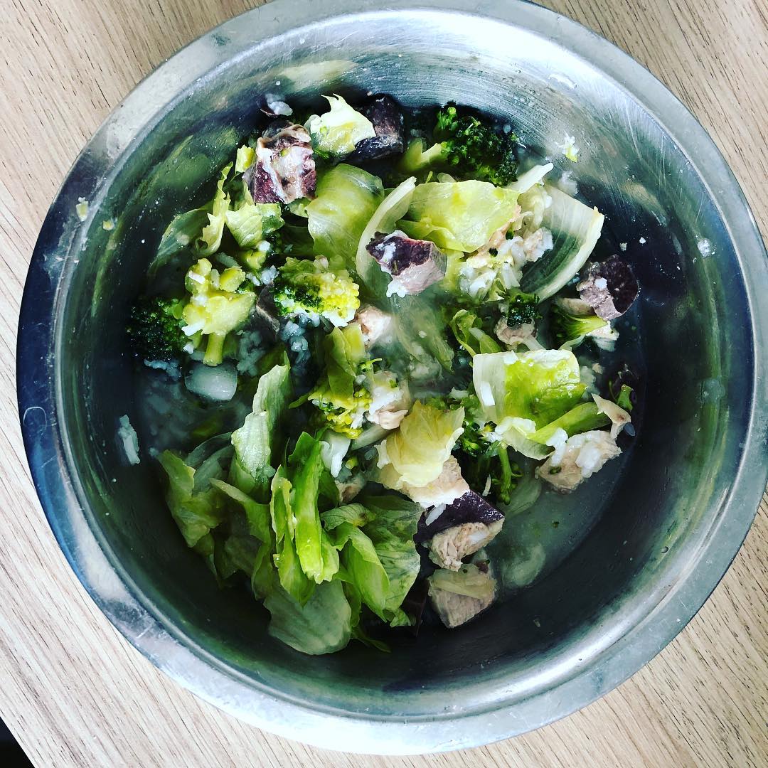 Today this was the dish of the day: Goat’s liver, Heifer heart, Turkey breast, Lettuce, Cabbage, Broccoli, Rice, Omega 3 and Dehydrated egg shell.